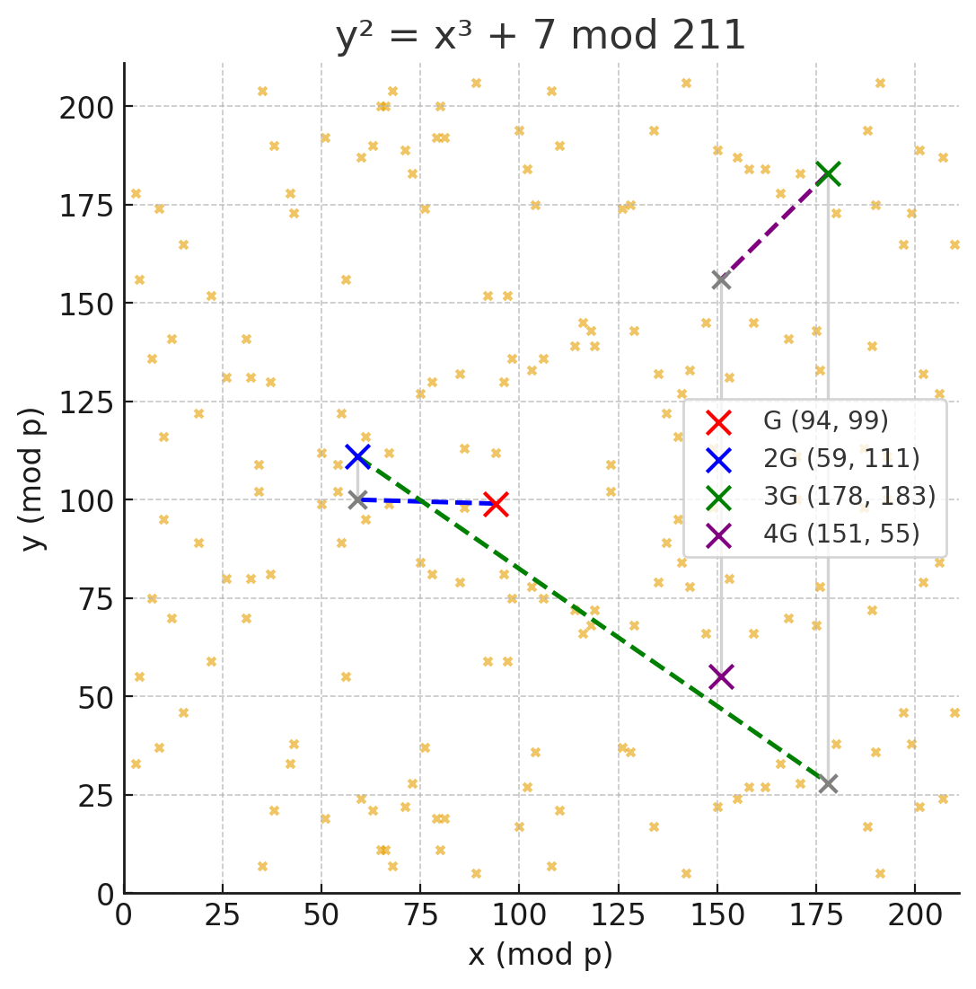 Keep in mind that this curve has a modulus of 211, whereas secp256k1’s modulus is ~2256.