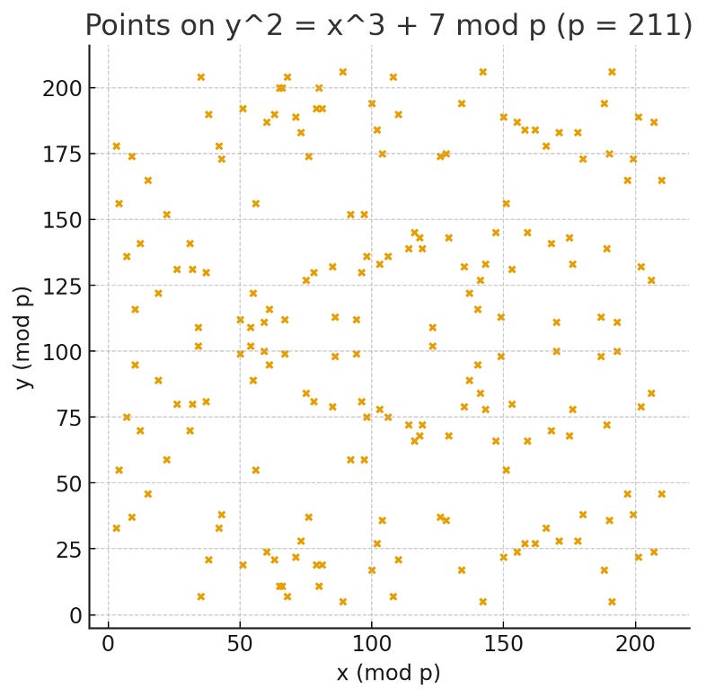 More generally, the reason it’s hard to reverse point addition in the elliptic curve is because of its structure, and this is why elliptic curves were specifically chosen for this. The equation mixes a cubic and a quadratic variable, which makes it nonlinear and hard to invert algebraically. Moving over from real numbers to finite fields means you can no longer use calculus to get a sense of direction, distance, or slope. There’s no “which way is closer” or “how fast am I approaching the target” – every step is a blind jump in a featureless, discontinuous space.