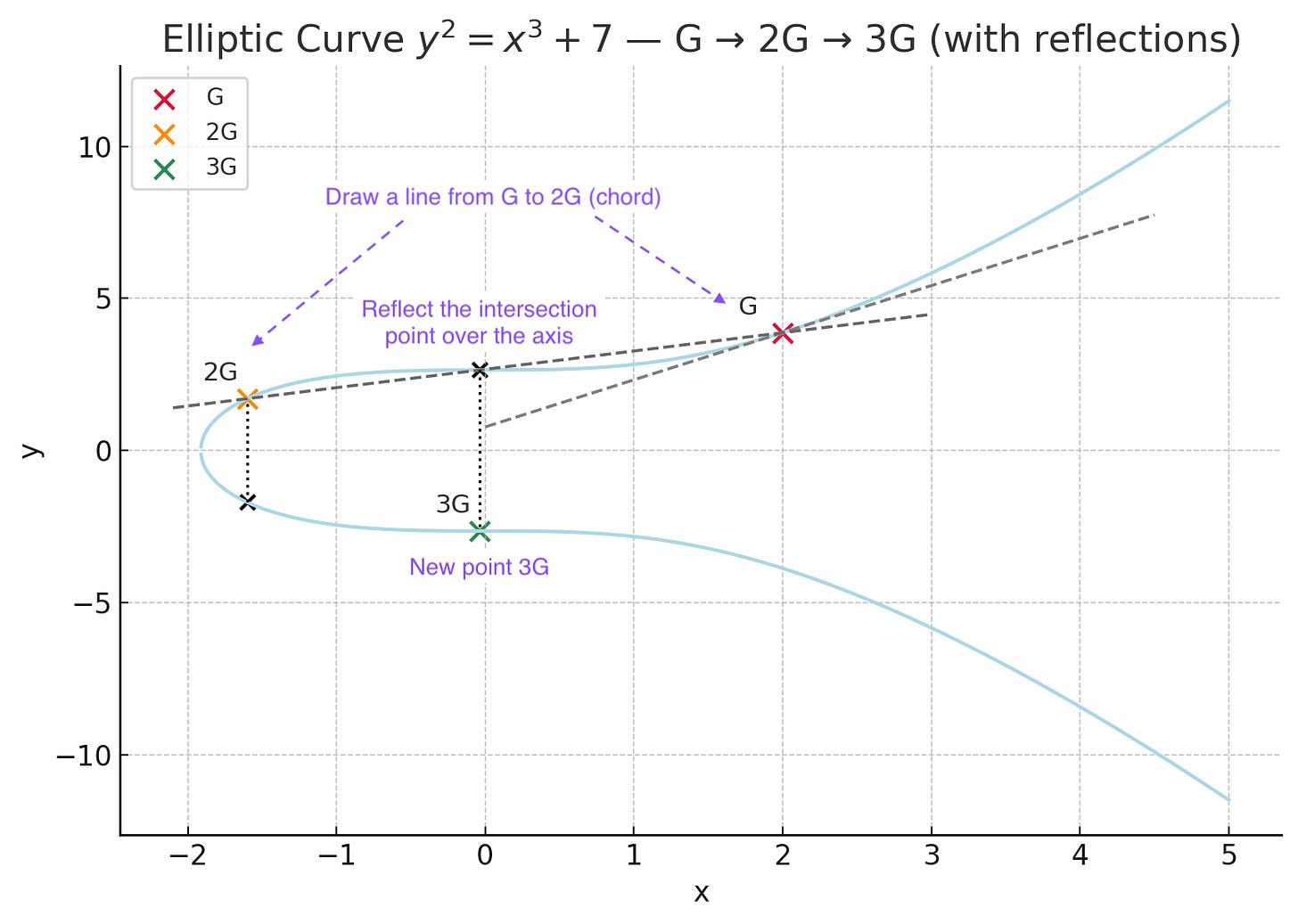 Once we have 2G, we want to keep adding G’s. So we simply add G to 2G, and we do this by drawing a line (or the “chord”) between G and 2G, finding the intersection point, and again reflecting this over the x axis. That gives us 3G.