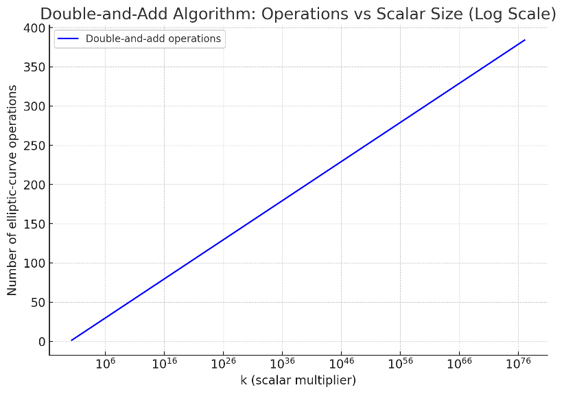 In complexity notation, you would write the “naïve” method of simply adding G to G k number of times as O(k) – the work required scales with the size of k. By implementing double-and-add, we massively reduce the work to O(log(k)) – depicted above.