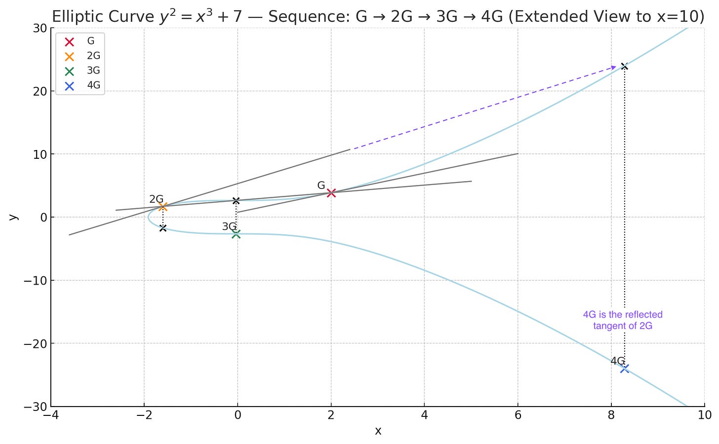 As you see in the chart again, there’s two ways to get to 4G. You can add 3G to G, plot the line between the two points, and reflect it across the x axis when you hit the curve. Or, you can simply double 2G, taking the tangent and doing the same reflection when you hit the curve. The tangent “doubling” operation is an insane short cut!