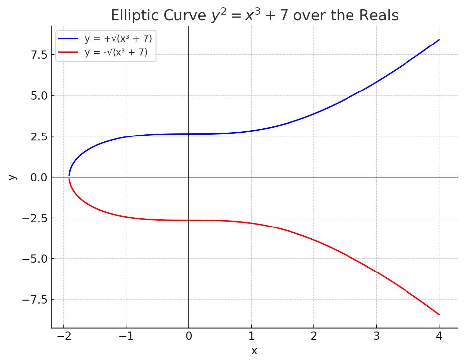 Plotting at the elliptic curve y2 = x3 + 7 not modulo anything, but simply plotted over real numbers, gives us this: