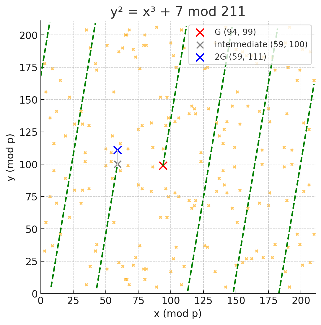 To give you a more concrete sense of the “scrambling” happening in true elliptic curve groups, lets look at our simplified modulated example from earlier. This is a minuscule example that sets the modulus at 211 instead of ~2256. Here we start at G (94,99) and perform the same exact scalar multiplication process we described above, just that it’s happening on the discrete, discontinuous field of integers.
