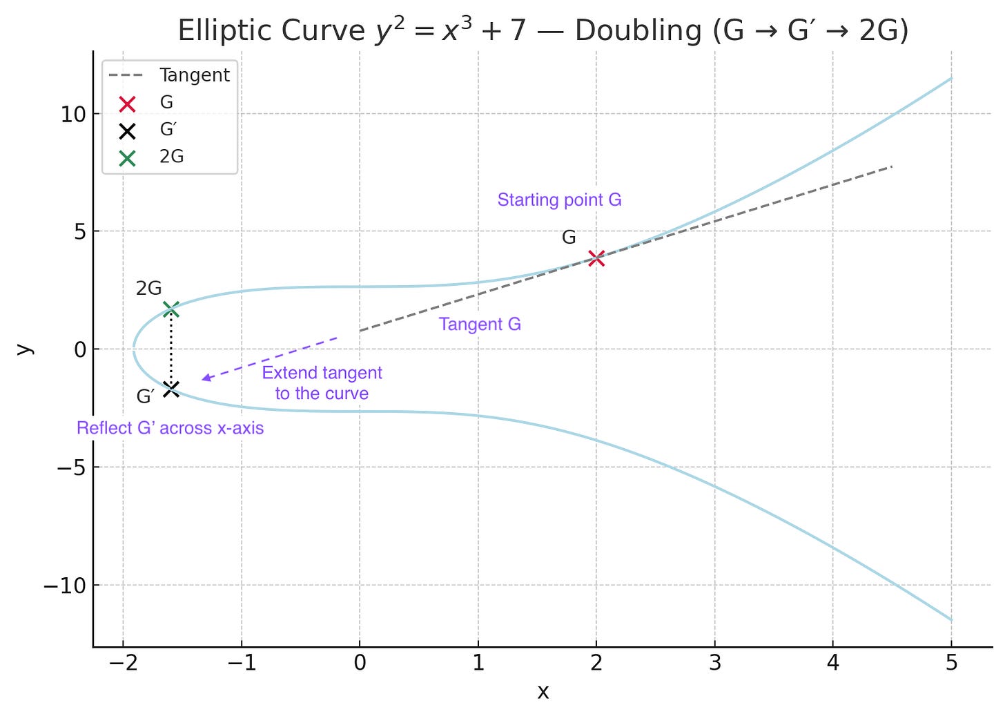 The way it works is exactly as described above. Instead of tediously adding G to G 1077 times, you process the bits of k one at a time, sometimes doubling (tangent rule), sometimes adding (chord rule). To process 256 bits, we need to do 256 doubles and around 128 adds. We don’t actually iterate through all the multiples of G. We skip ahead.